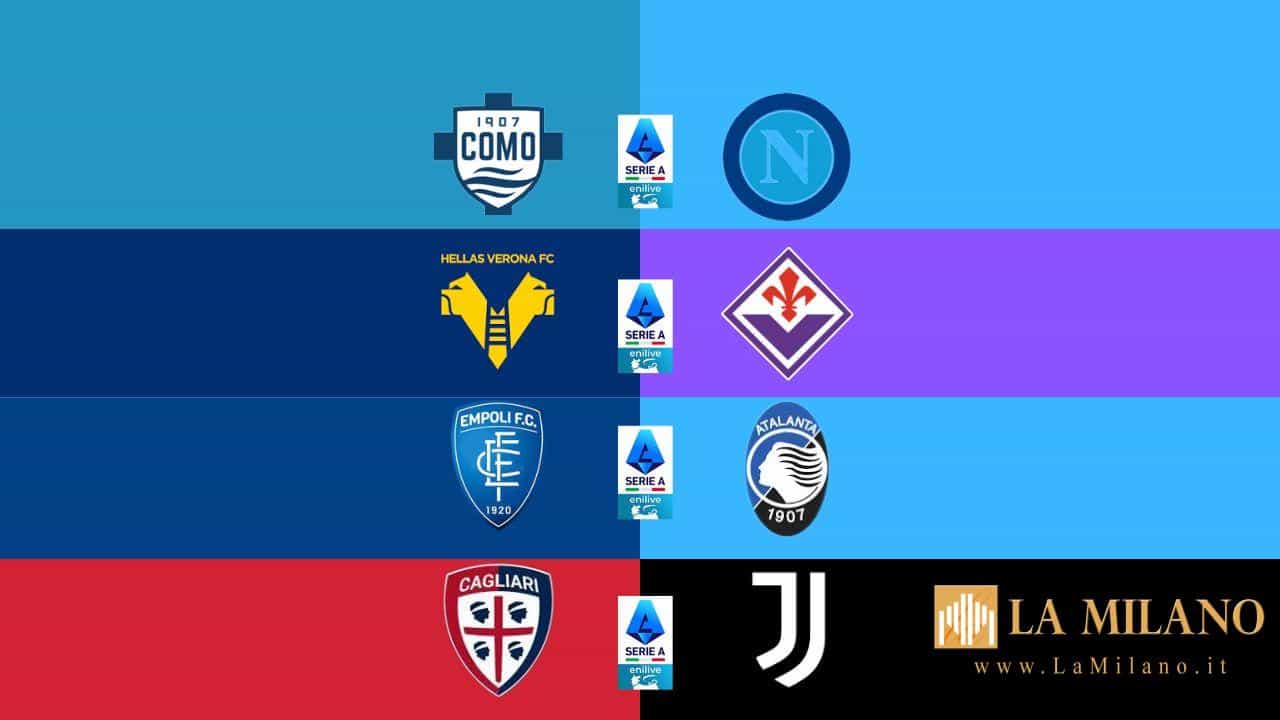 La ventiseiesima giornata di Serie A continua in questa domenica con altre quattro partite. Alle ore 12.30 si sfideranno Como-Napoli; alle ore 15.00 scenderanno in campo Verona-Fiorentina; alle 18.00 si giocherà Empoli-Atalanta e a chiudere alle ore 20.45 sarà Cagliari-Juventus.
